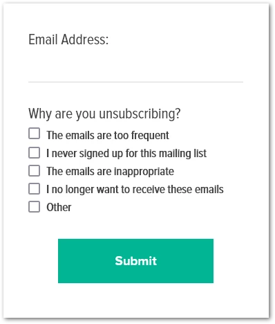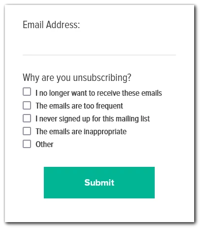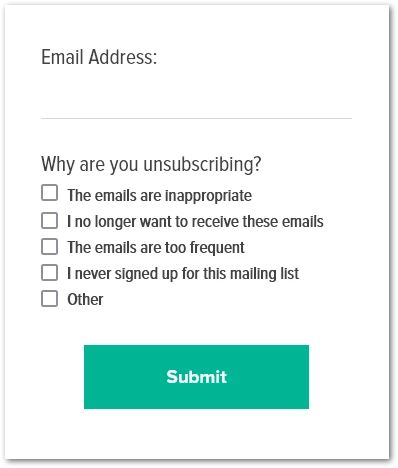 For example: “I no longer want to receive these emails,” “The emails are too frequent,” “I never signed up for this mailing list,” and “The emails are inappropriate.”