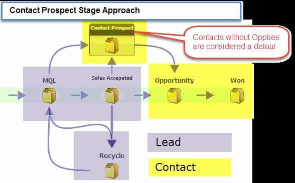 Under this model, the focus is on the Lead. Once a Lead is converted to a Contact, it is assumed the Sales rep is now responsible for working the Contact. If the Contact is not part of an Opportunity, it drops into the Contact Prospect detour bucket awaiting an Opportunity.