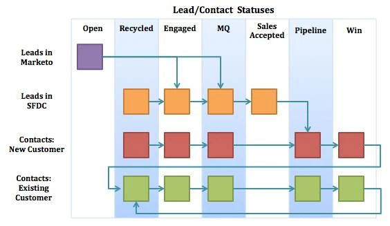 This approach uses a single Lead Lifecycle status field that works independently of the SF Type (Lead or Contact). For companies that work Leads and Contacts in parallel, this process gives more flexibility. Here, reps and marketing focus on the Lead Lifecycle field, ignoring whether or not the person is a Lead or Contact. Only Contacts can have a Won or Opportunity stage.