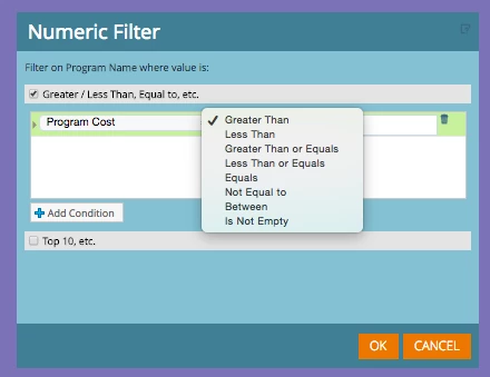 Back story: I'm trying to gather a list of all my programs and view the ones that do NOT have program costs associated with them so that we can retroactively fill them out. I am able to build a very large report in Analytics, but the filters aren't powerful enough for me to do quite what I want. This is when I turn to RCE. I set up a Program Cost Analysis report and tried to filter by "Program Cost" and choose "Is Empty" but that's not one of the options, although "Is Not Empty" is. Doing "less than" won't work because it still requires a number to be in the value and therefore excludes all the programs I want to see in the list.