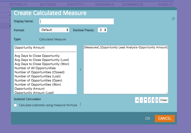 I'm poking around in RCE and am trying to create a custom measure to use in an opportunity analysis field. Essentially, I want to recreate the Opportunity Amount measure, but using a custom synced field (we don't use the native Amount field in SFDC opportunities). However, when I click "Create Calculated Measure" the only fields visible are standard fields or existing measures. Is it not possible to create a custom measure based on a custom field?