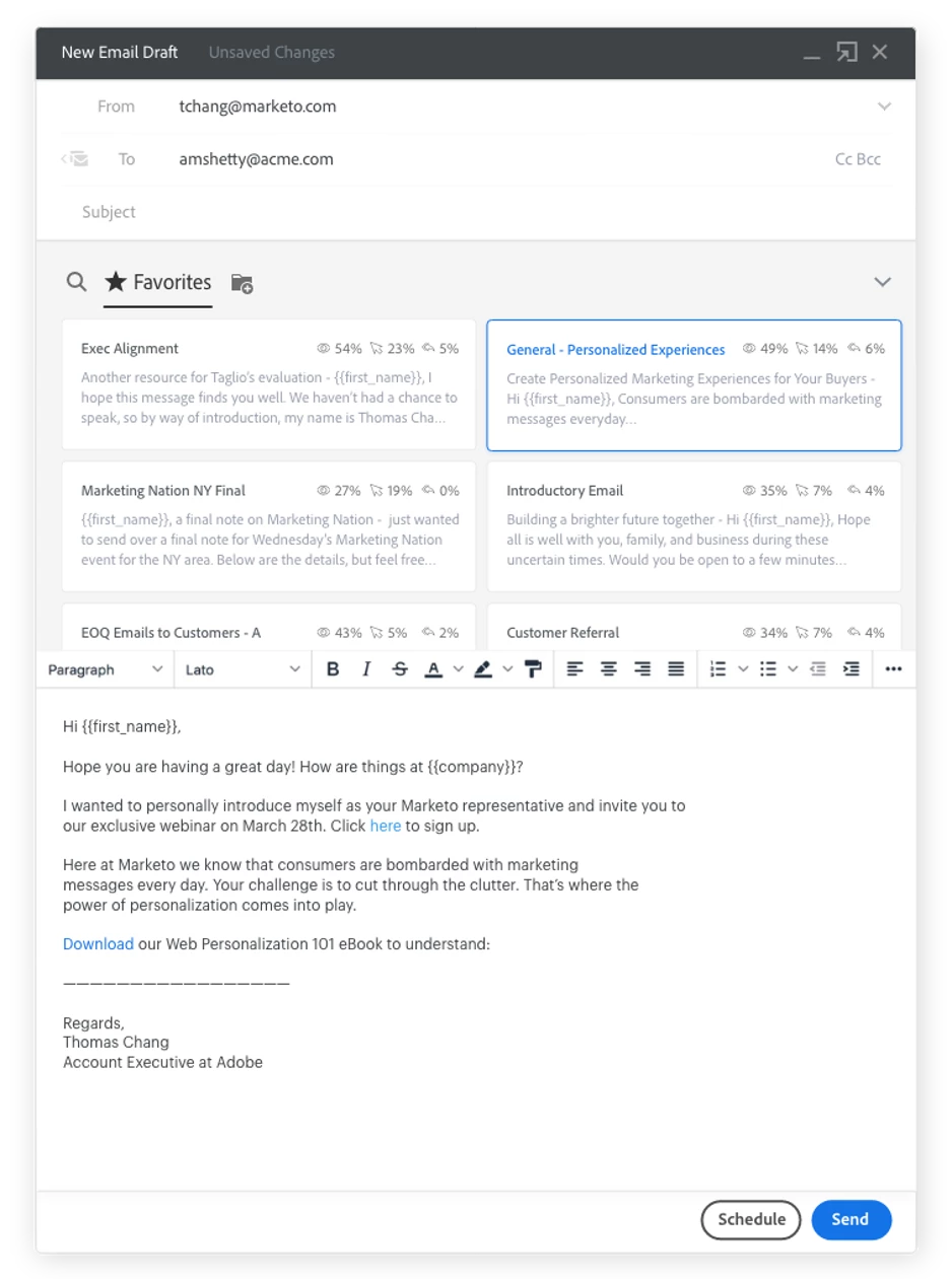 Sales Insight Actions provides reps with multi-step playbooks, customizable email templates, an integrated dialer, and task management tools to facilitate meaningful engagement with customer and prospects, all within Sales Insight and all within the Salesforce CRM. These activities are also tracked in Marketo Engage and can be leveraged via triggers and filters to deliver holistic experiences across both marketing and sales touch points.