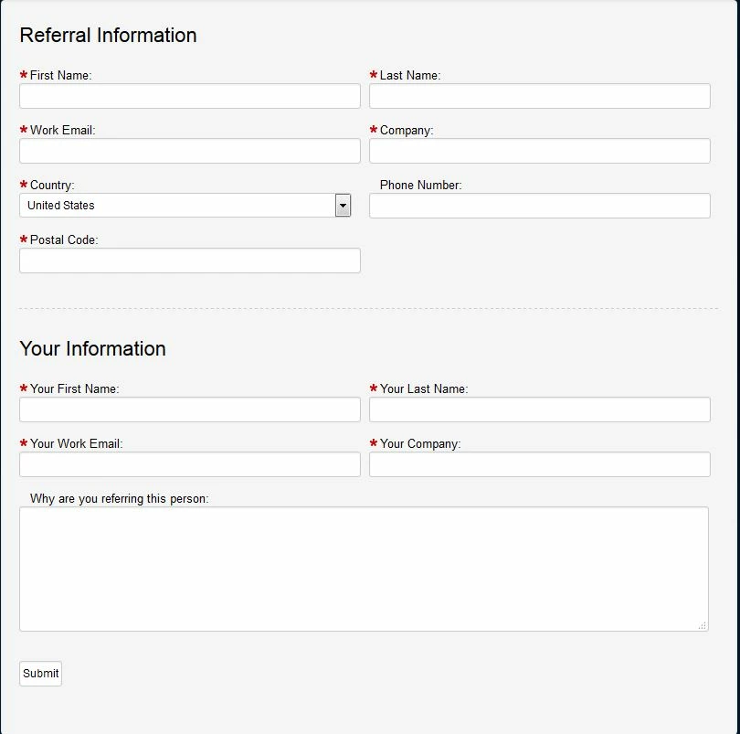 The person who referred someone (the real person who filled out this form) puts their information in the "Your Information" section. We custom fields in Marketo called Customer First Name (Your First Name above), Customer Last Name (Your Last Name above), Customer Email (Your Work Email above), Customer Company (Your Company above), and Customer Referral Reason (Why are you referring this person above).
