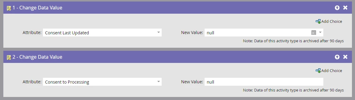 When the same person hits the form again, the form will not re-calibrate despite these values being null. The result is that the "consent to process" options no longer appear while clicking the submit button writes another "Consent last updated" date.