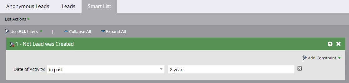 And a "Not lead was created" filter (no time constraint) for smart campaigns that should not run after lead creation