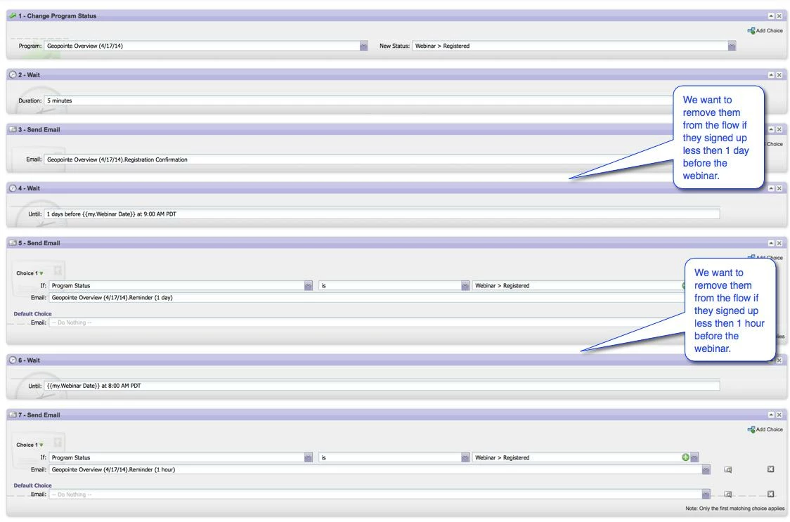 For our webinar programs, we are doing registration through Marketo and have reminders setup as part of the Flow. We mimic the GoToWebinar flow and send a confirmation and then a reminder 1 day before the webinar and again 1 hour before.