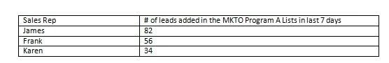 we have a program that we are using to add leads to several lists. We are looking at having a report (with notifications sent to users) that shows how many leads were added (in all those lists) per sales rep (field) in last 7 days.