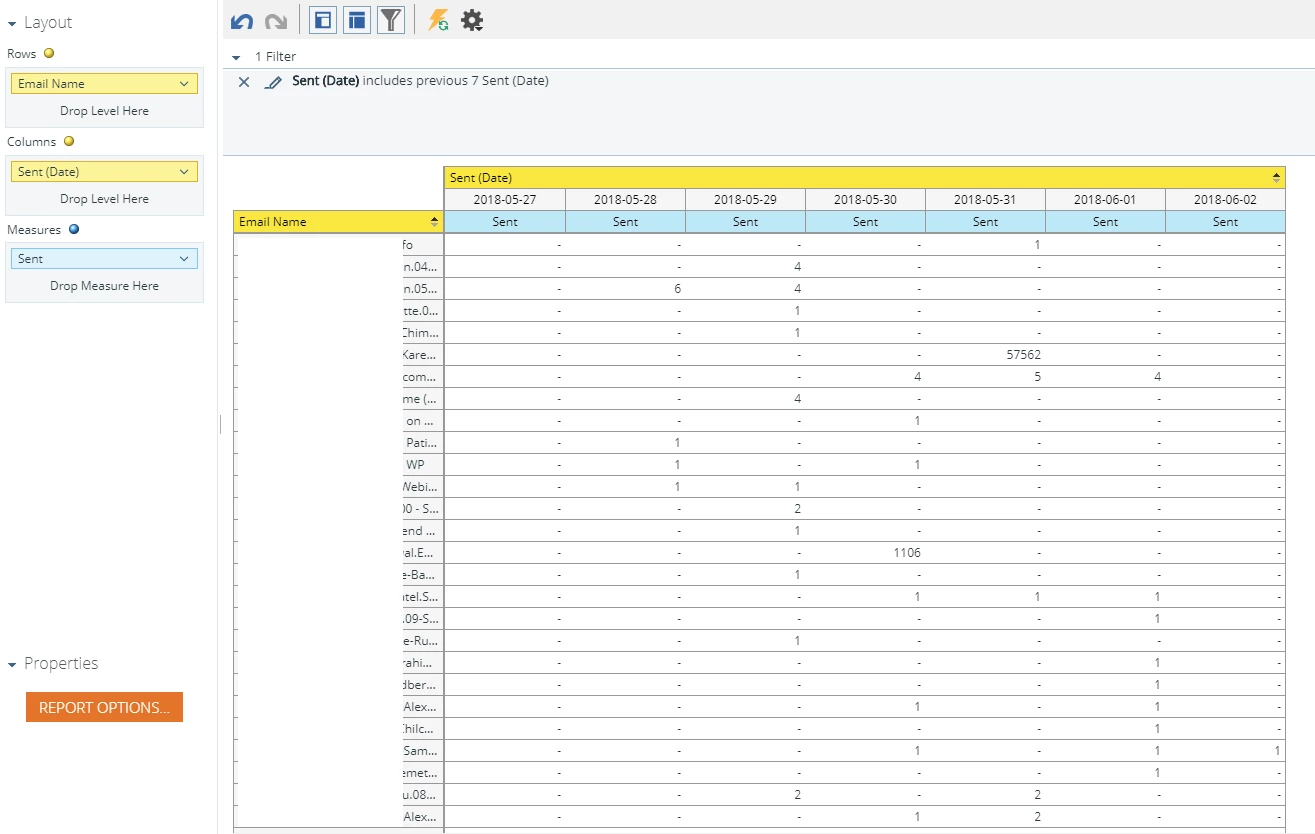 Question on reports. I want to be able to see how many sends were sent per day in a triggered program. None of the email reports in Marketo are built to look at number of sends per day. To keep track of all the running programs we have and to monitor the health of the programs by looking at the pattern of the volume (# of sends), in other platforms, I would run a weekly report (for example Sunday - Saturday) that generates all emails sent for the week broken down by day. The reports are only set up to run the total send for any given time. Is there a way to create a report like this?