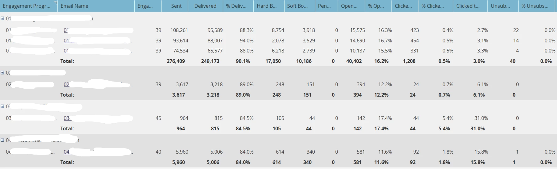 The engagement stream performance report gives all the emails, grouped by stream, with performance reports (delivered, opened, ...) :