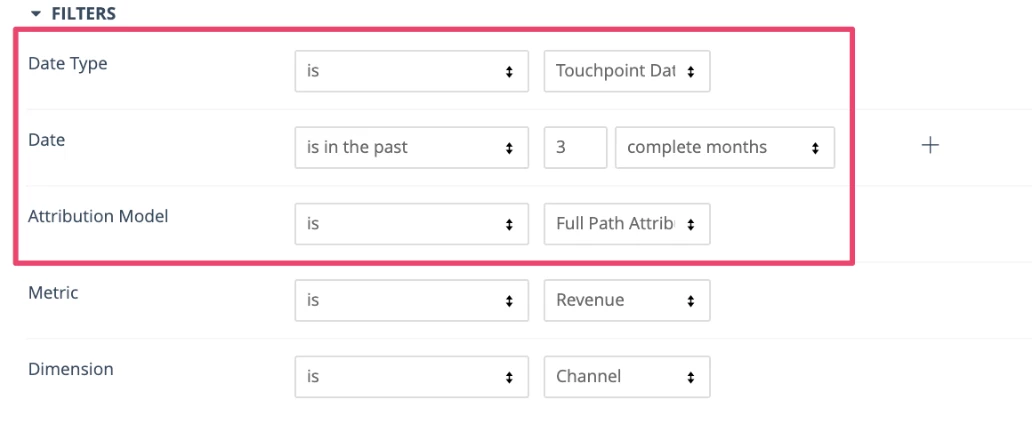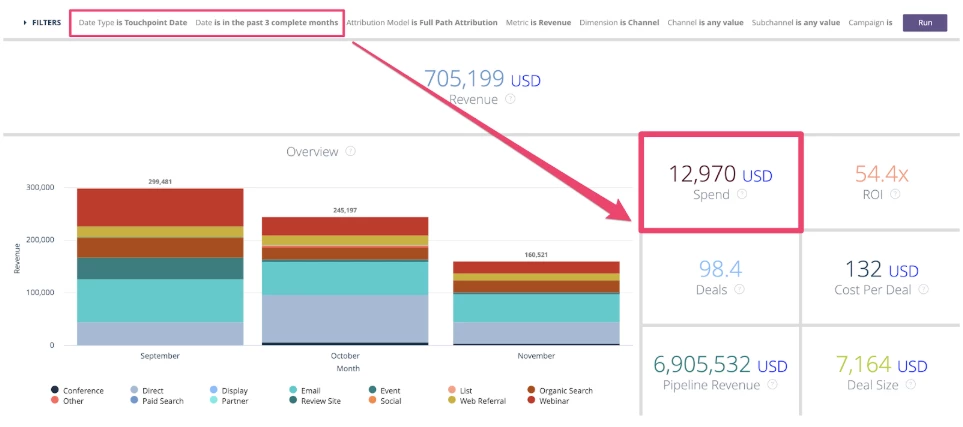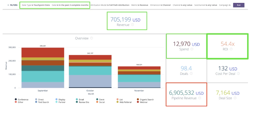 Another important takeaway from the ROI report above is the ‘Pipeline Revenue’ represented within the red box. This means that from the $12,970 USD invested over the past 3 complete months, we’re currently attributing $705,199 of closed won ‘Revenue’, but we’re also attributing $6,905,532 of open/potential revenue (‘Pipeline Revenue) to touchpoints created from the same investment! What we would expect to see is a portion of the ‘Pipeline Revenue’ close over time, feeding the ‘Revenue’ number, and thus, the ROI number would increase over time. The ‘Spend’ number is fixed because we can’t go back in time to spend more in the last 3 complete months. This is the importance of using a ‘Date Type’ of “Touchpoint Date” within any ROI reporting: It defines the amount (I)nvested, and ensures the amount of (R)evenue attributed is attributed back to the same touchpoints that were sourced from the investment (for every dollar spent, how much was made?).