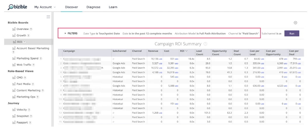 Pro Tip: Filter in on Marketing Channels, Sub Channels, and/or Campaigns in which you know the Marketing Spend data is complete and accurate. The example above is for all Marketing Channels, but if some Channels don’t have the related Marketing Spend data uploaded, the ROI reporting could be in accurate. See the example below, this time in the ‘ROI’ board that is focused on the Campaigns within the Marketing Channel of “Paid Search”, a Channel with very granular Marketing Spend data via the integrations: