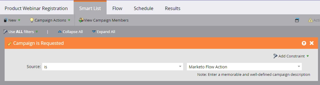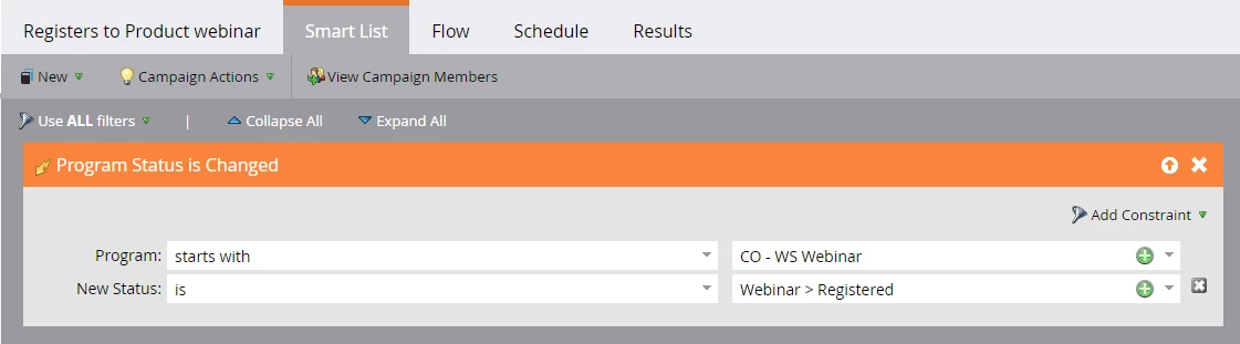 We always use “Program - Starts with” for all standard content. In my example I am assuming you would be doing multiple webinar types - thus this is the Product Webinar, there may be other types. If you only do one type, well you need only one webinar program, or if you have identified they are about relative equal value.