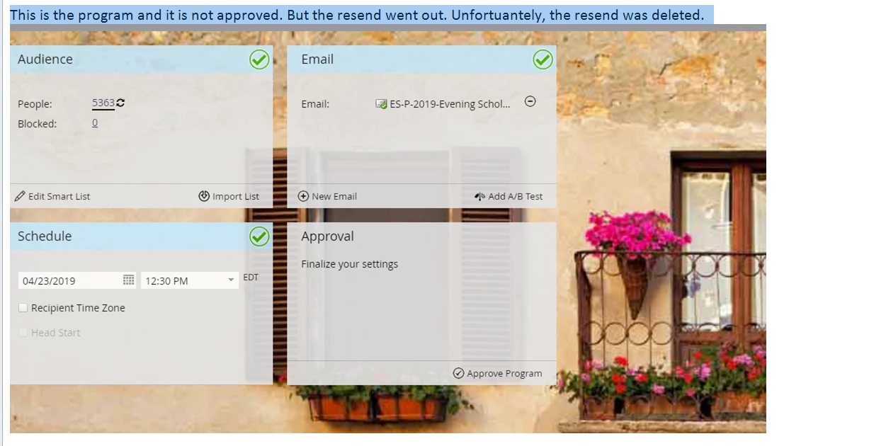 So the main email didn't go out. But within this program there was a resend -- in the campaign folder. And the resend was approved and did got out. However, it was our understanding that anything within a program could not go out unless the program itself was approved. 800 people were hit with the resend