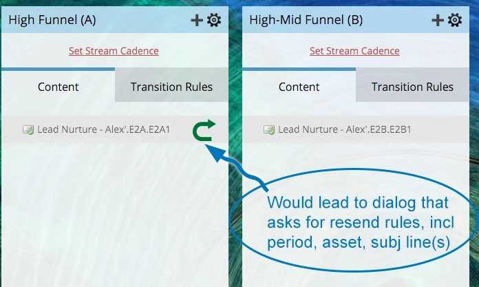 Certain that implementing this feature would be complicated as hell, I'm nevertheless going to throw it out there, because I know I'm not the only one to have asked (and Marketo isn't the only tool that doesn't support this): one of the major limitations in the Engagement Nurture is the lack of ability to set a resend policy. Such a policy requires separate, subordinate campaigns, which does not scale well at all, and the logic is nearly as convoluted as the original Traffic Cop concept (before the Engagement Engine was available). However, when we create nurture programs, a resend policy is a de facto part of the structure, so this has been painful for us.