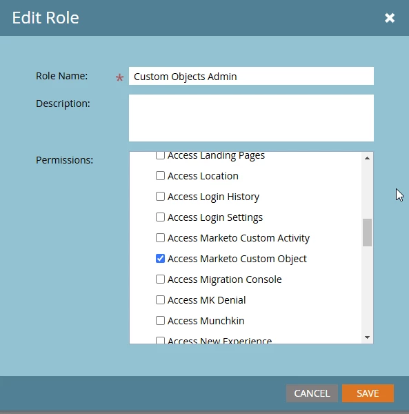 I am stuck at one instance where user has requested access to create custom objects, and I have created a different/new role for all custom object creation/edit access, specifically for this user. And initially, I had assigned that new role to this user, in addition to what he already had (Standard user). However, he was not able to create/view custom objects, which was troubling. So, I checked on a dummy user with just that new role, it does not work (Admin section shows up empty), meaning the role I created has some limitations to it. (as per this marketo doc) least access of the selected roles would be given, so tried giving temp admin access but that does not seem to have fixed it too. See snip 1 for what dummy user sees post Admin enabled. Snip 2 for Roles selected for dummy user.