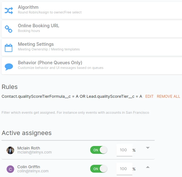 Additionally, you can also adjust the weights assigned to “Active Assignees” using the percentage field next to each assignee. For example if we want Mclain to receive double the amount of people than Colin then we will set Mclain’s percentage to 200%.