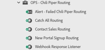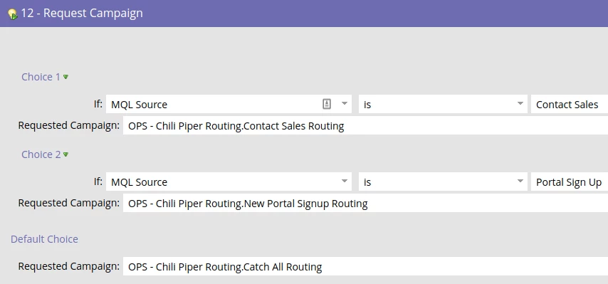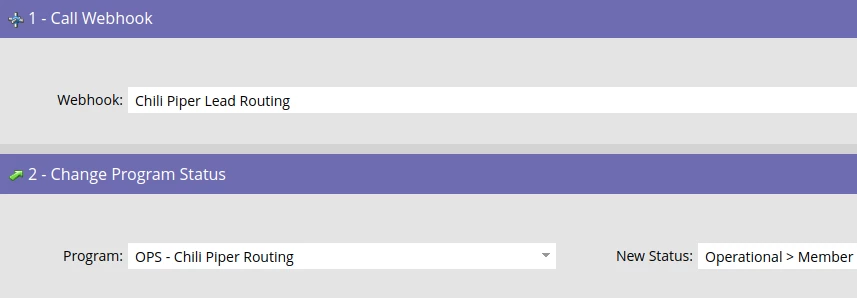 The “OPS – Chili Piper Routing” program channel type is “Operational” which has a single status of “Member”. In each of the campaigns below there is an optional “Change Program Status” action that changes the status of people who pass through each of these campaigns to “Member” so that we can keep track of all the people who pass through these campaigns within the program members list.