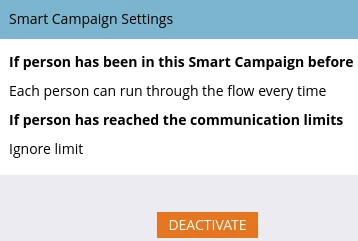 - Activate the smart campaign in the “Schedule” tab and adjust the smart campaign settings so that “Each person can run through the flow every time”