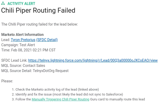 Whenever this event happens, the “Send Alert” action is used in the flow to send the “Alert – Failed Chili Piper Routing” email to members of your marketing and/or sales operations team who own the routing process.