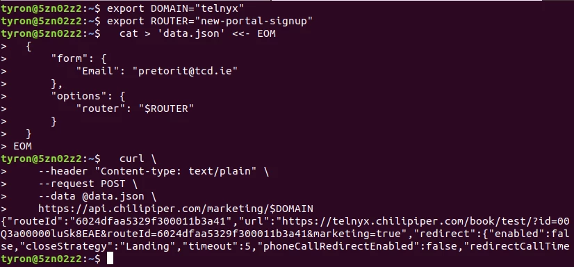 Contrasting the successful and failed person assignment responses below it can be seen that for a successful response ?id= follows the “https://telnyx.chilipiper.com/book/test/” URL, whereas for a failed response ?routeID= follows the url.