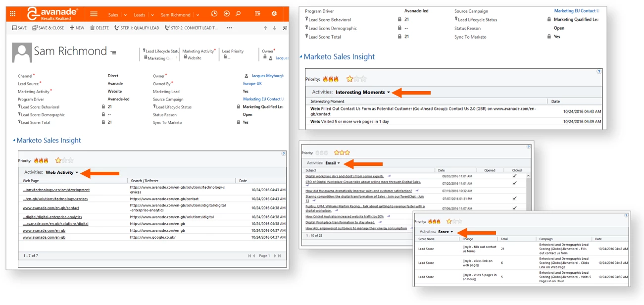 I am familiar with Sales Insight in SFDC but not in MS Dynamics. In SFDC you get five tabs at the top that includes web activities and email activity (sales mail and Marketo mail). I was wondering how much of this information do you get in Dynamics. If an user can tell me I would very grateful as I can't find this information in the documentation.