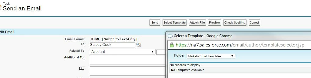 Hi. Just created new email in Design Studio and published to Marketo Sales Insight. I am certain of this because I can see them in Sales Insight for Outlook. However, I can't see them in Salesforce under Leads/Send an Email/Select Template. No templates there.
