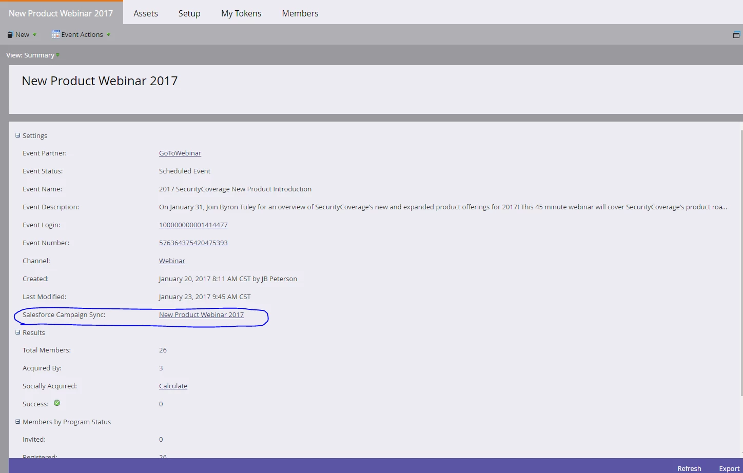 I created a new Saleforce campaign, for a webinar, in Marketo via this page,(see circled area below):
