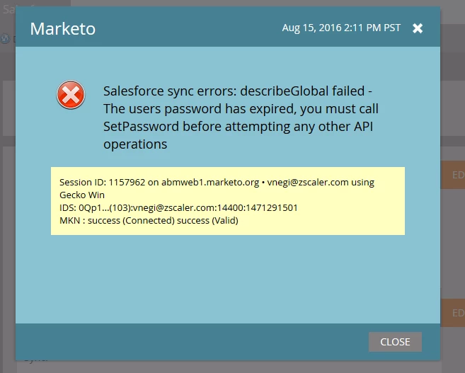 There is a salesforce sync error that show at the admin section of marketo where i tried to check last sync time period but it showed such error that i attached snapshot of