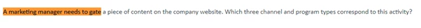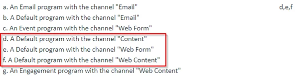 A marketing manager needs to gate a piece of content on the company website. Which three channel and program types correspond to this activity?a. An Email program with the channel "Email"