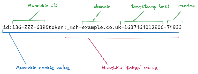 The token contains everything else: the domain corresponding to the Munchkin domainLevel option, the millisecond timestamp of when the cookie was first set, and a random integer to increase uniqueness.