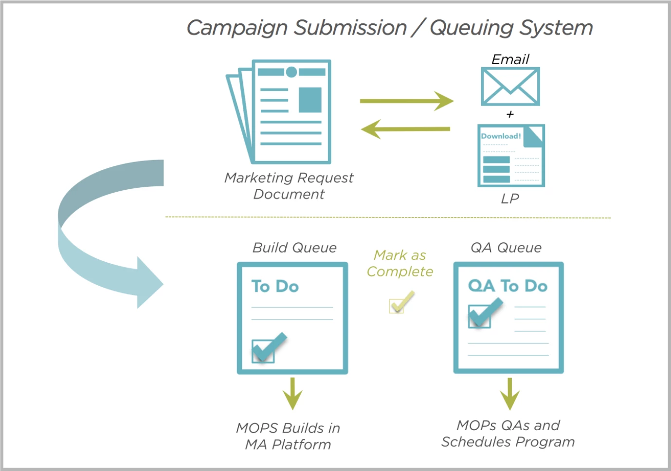 A centralized submission process is a great way to combat last-minute requests from Marketing Managers, over-communication to prospects, rogue marketing programs, inadequate QA for marketing communications, and scaling inefficiencies of the marketing operations teams. It standardizes the way Marketing Managers send their requirements to the Marketing Ops Specialists so that all relevant information is gathered before the campaign is implemented. It sets up an iterative relationship between the Manager and the Marketing Ops Specialist, which means errors are more likely to be caught and corrected before they reach your prospects’ eyes. It also provides a level of governance that guards against rogue marketing requests that disrupt other campaigns, and ensures that the method by which you obtain campaign performance metrics is consistent. Building out a centralized submission process is an iterative approach. Marketing Ops Specialists can build significantly faster when they have all of the build requirements consolidated in one place. Marketing Ops Architects can keep a steady eye on the speed that campaigns are being built, how SLAs are hit or missed, and refine program templates (and project management software) to smooth out problems as they come up between Marketing Managers and the Marketing Ops team.