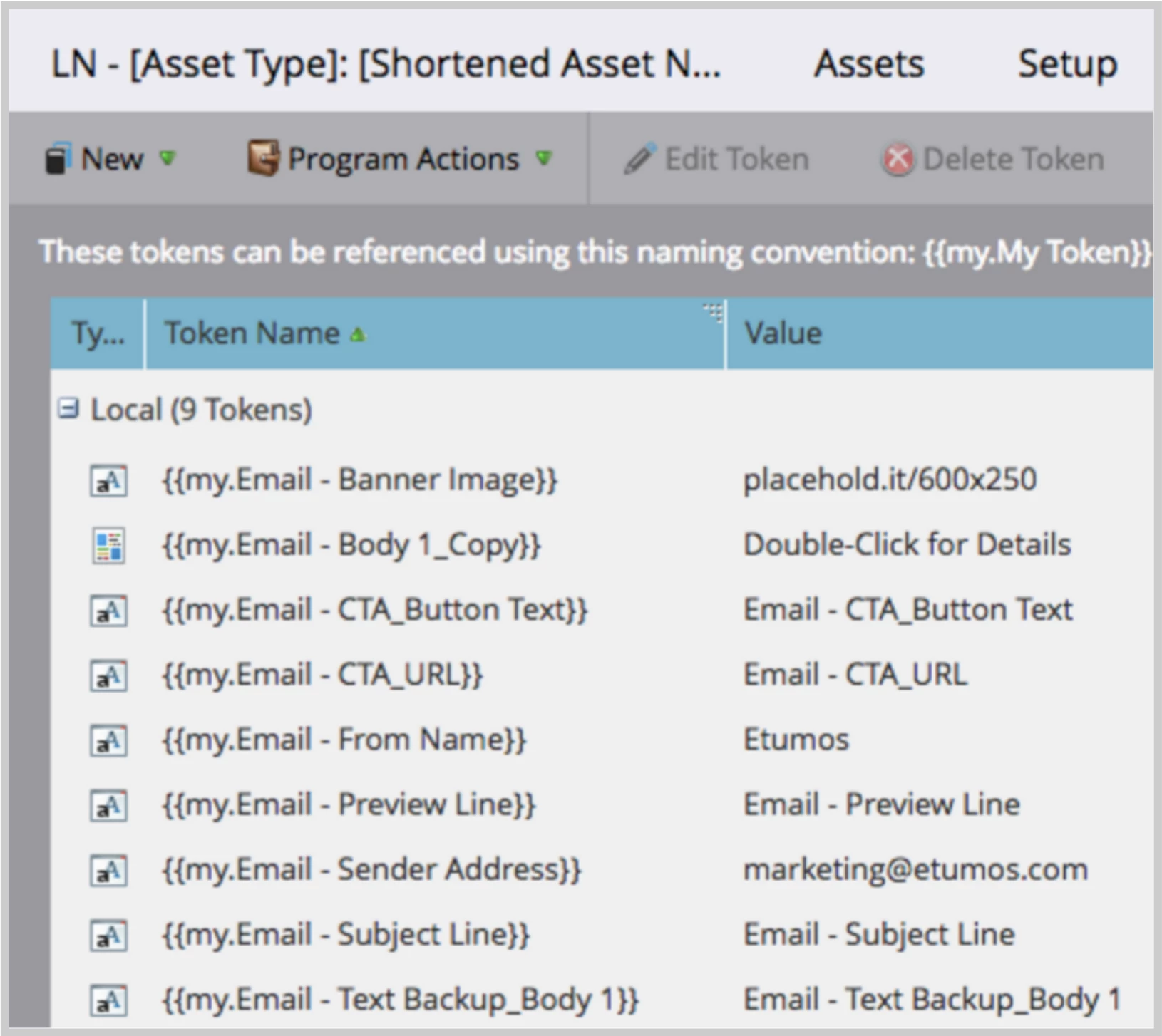 This makes creating email and landing page assets turnkey. Go one step further by housing your email and landing page assets in a templated program. That way you can simply clone an entire program that contains not only the necessary elements for your marketing initiative, but the tokens used for your email and landing pages. To learn more about program templates, we've compiled a full guide here: “The Marketo Expert’s Guide to Program Templates.”