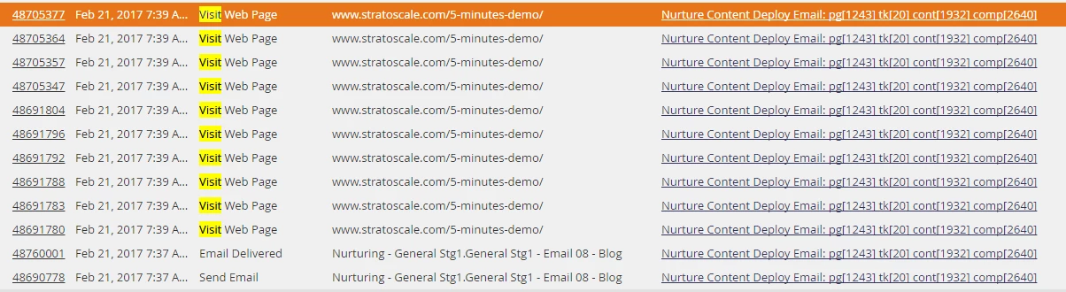 I have an issue in giving the right score for my leads becuase of the following - look at this guy's log below. He is being counted at the exact same minute for 10 web visits of the SAME WEB PAGE...