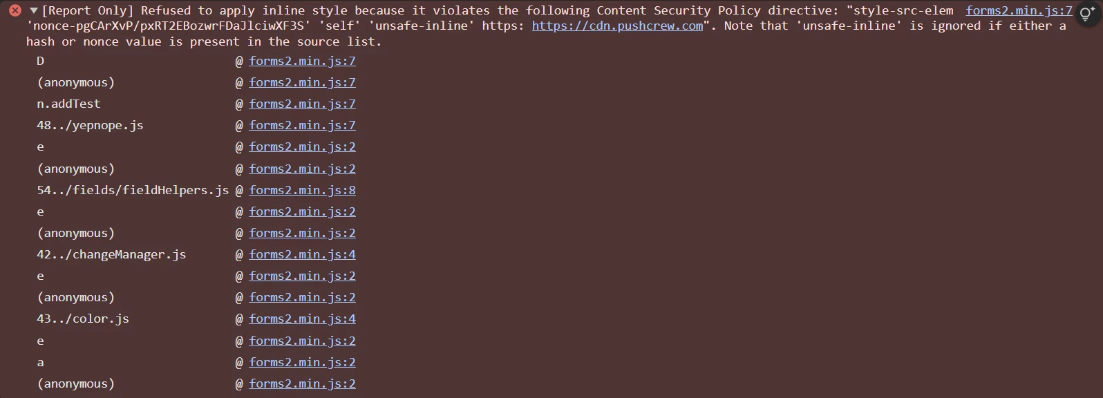 To enhance the security of our domain, https://planonsoftware.com, we are working to enable nonces in our Content Security Policy (CSP) header. As part of our testing phase, we enabled nonce support in Reporting Only mode in our development environment.