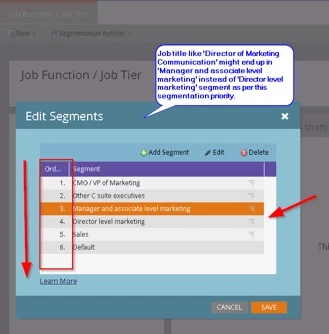 Job titles like ‘Director of Marketing Communication', or ‘Marketing Director’ might end up being in Job function 'Manager and associate level marketing' instead of Director level marketing' in above segmentation definition.