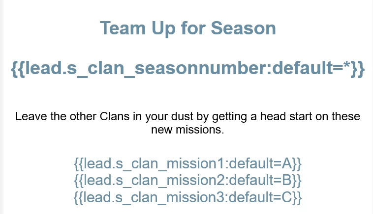 I have created dynamic email fields using lead tokens in the emails(and have added them to field management under admin). For example: s_clan_leaderboardinfo, s_clan_clanname. s_clan_season# etc.