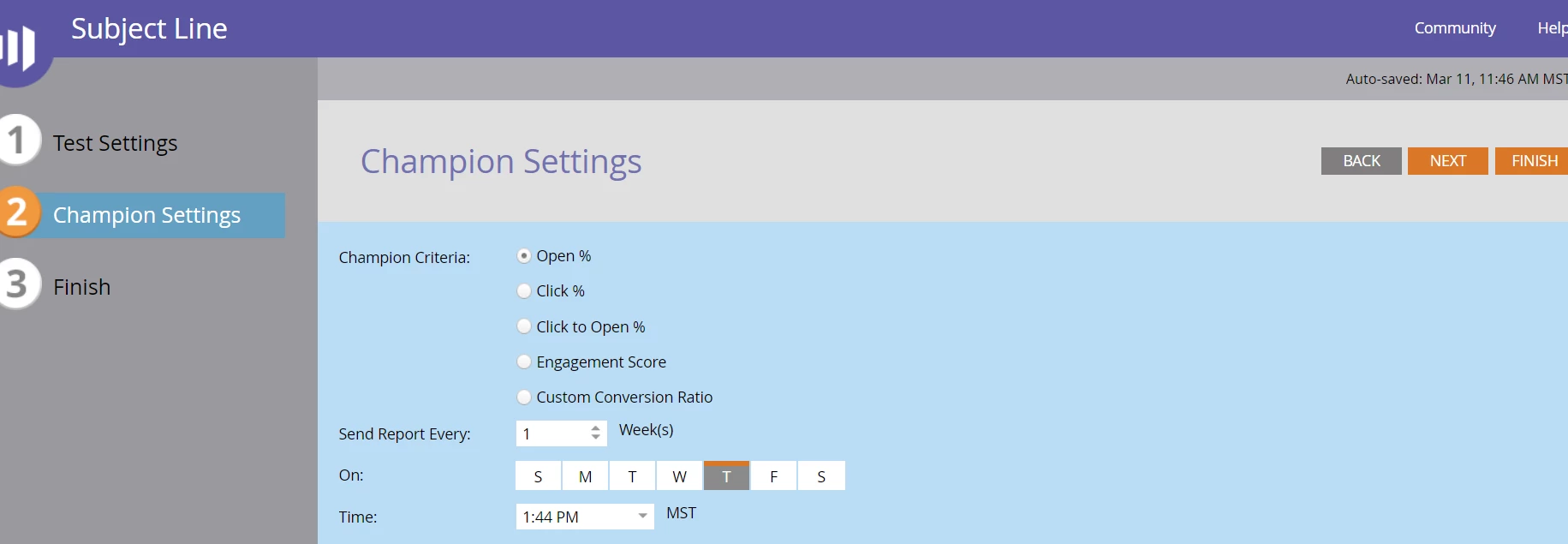I am trying to set up an A/B split test for the subject line for one of our emails. The Champion/Challenger setup is confusing me a bit. I do not want to send a portion before the actual email send to test, and then send the winner subject line to everyone else. I would like to send this test to 100% and split it evenly 50/50 with the subject lines on the day of the actual send. My question is, if I move it to say 100% receives Challengers like in this screenshot: