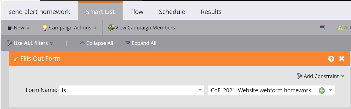 If you haven't tried adding the web page constraint with fills out form then please try adding the Web page constraint.