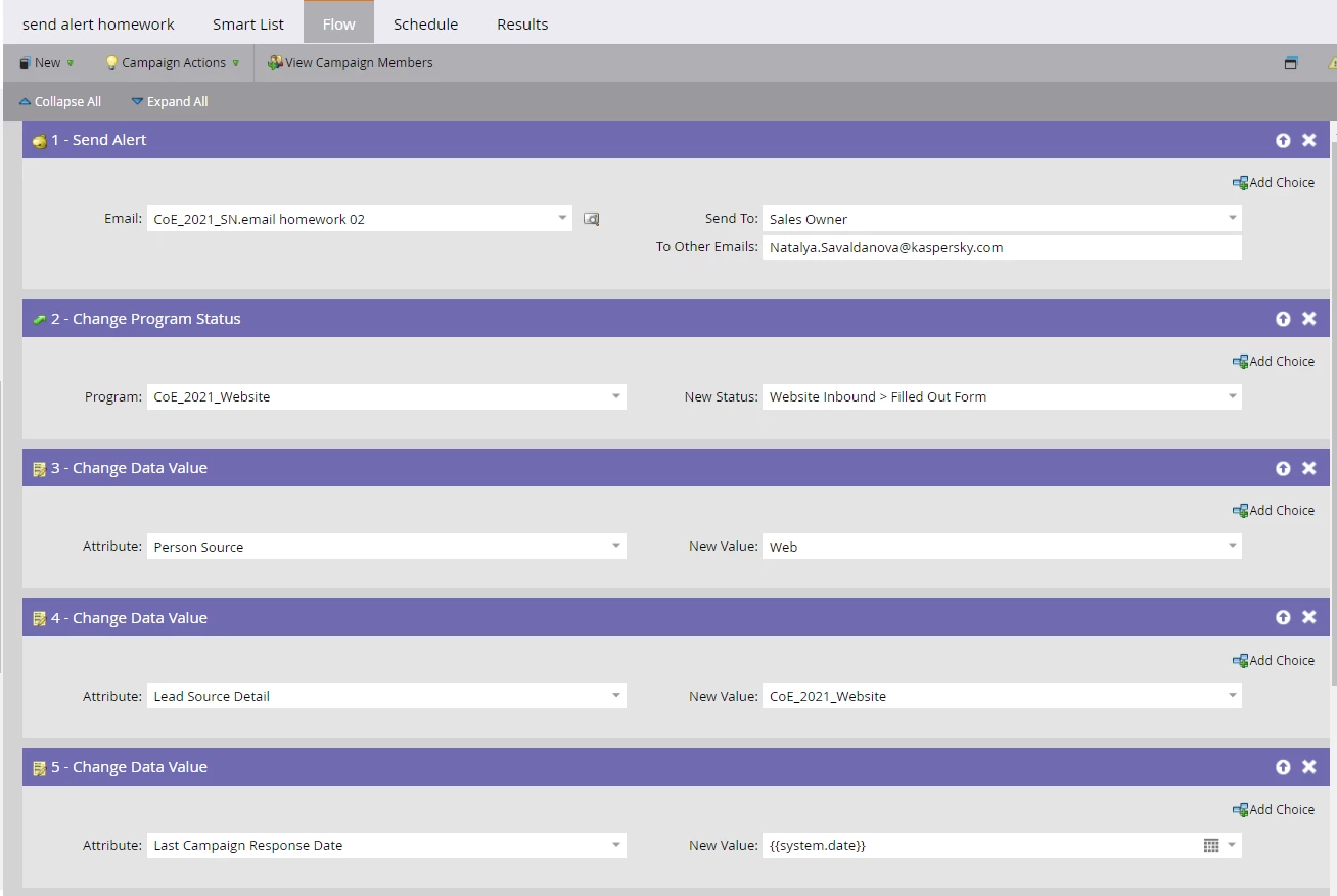 I created a new smart campaign for send alert to my email address . I included in this smart campaign - fills out form and send alert on the flow. But when I submitted the web form I don't have any email about it.
