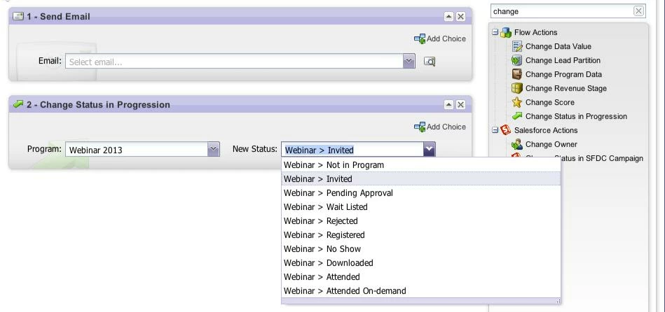 Flow: (Send Email = Email: [EmailName]), (Wait = Duration: [Periodof Time]), (Change Status in Progression = Program: [ProgramName]; New Status: [Webinar> Registered])
