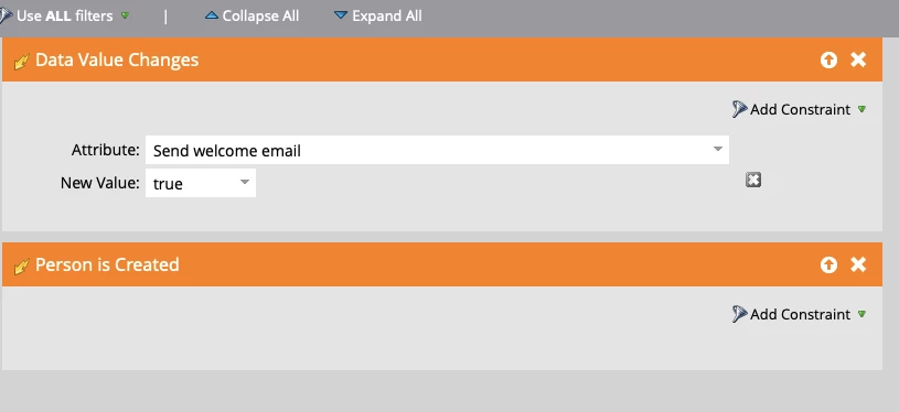 I used this attribute in my Data Value Changes Trigger and added the new value to be 'true'. Note that there was no value before that. After reading some posts, I saw that it might be good to also include a trigger: Person is created. So I added that.