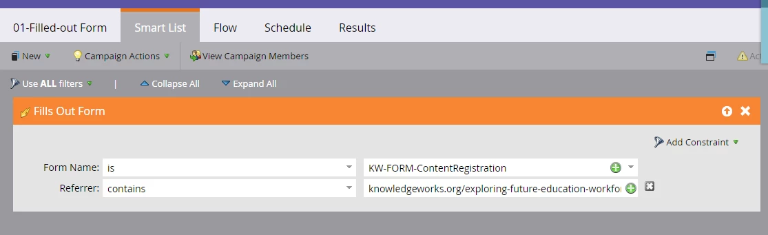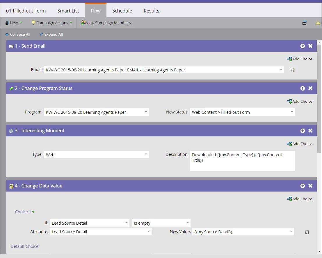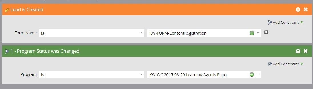 Our capture acquisition program smart campaigns are triggered off new leads created from our content registration form, then filtering on specific web content program status changes as follows. Any recommendations on a different way to do this? Thank you in advance for any advice!