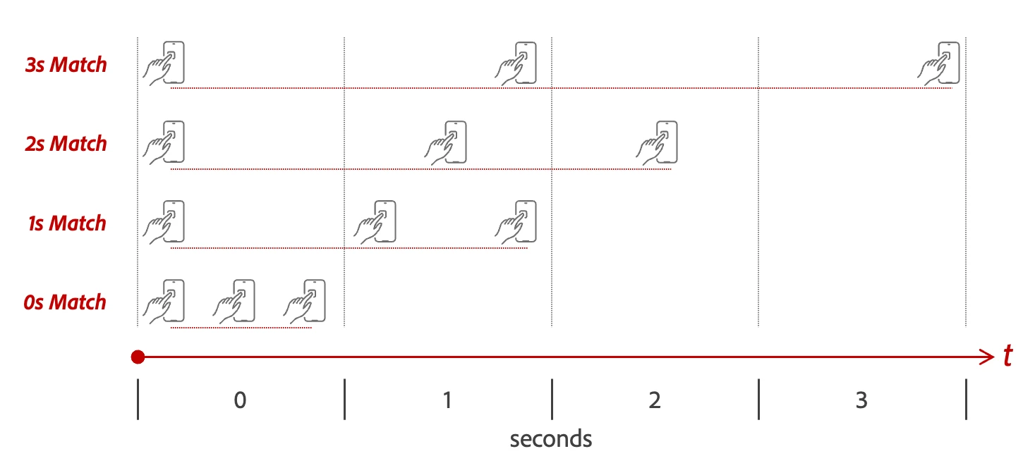 The proximity pattern match is a data analysis to determine if the actions are human-like or bot-like. Human activity has inherent pauses between actions, where bots are rapidly crawling and clicking at extremely high rates. When a Proximity Pattern recognizes many interactions within a second or two it can make the assumption that the patterns are not likely to be human or the true actions of the e-mail recipient. With this matching option you see one additional setting called “Duration Between Activities.” This is the time window you want Marketo to use to assume that 3 or more actions represent a bot activity. The value can only be the integer 0, 1, 2, or 3 second(s). The image below shows examples of click actions that would match this pattern for the four different duration options.