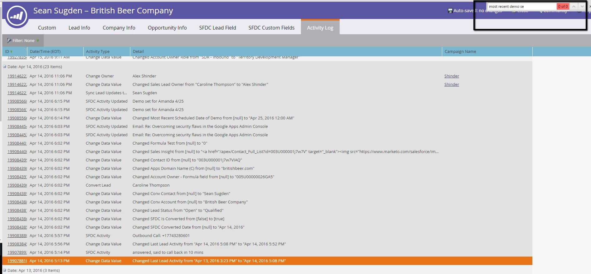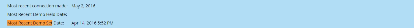 Mike called because the field most recent demo set date was not showing up in activity logs. This is due to some backend Marketo logic to not show these updates on records because this would bog down the system. The data still comes through.