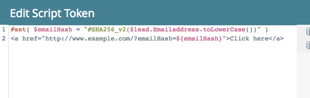 #set( $emailHash = "#SHA256_v2($lead.Email.toLowerCase())" )