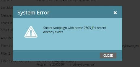 Is anyone seeing this same error, screenshot below? Our team is seeing this error when creating new Smart Campaigns, despite there not being a Smart Campaign with the same name. One member of our team suggested it may have to do with new updates, because we started seeing it after this.