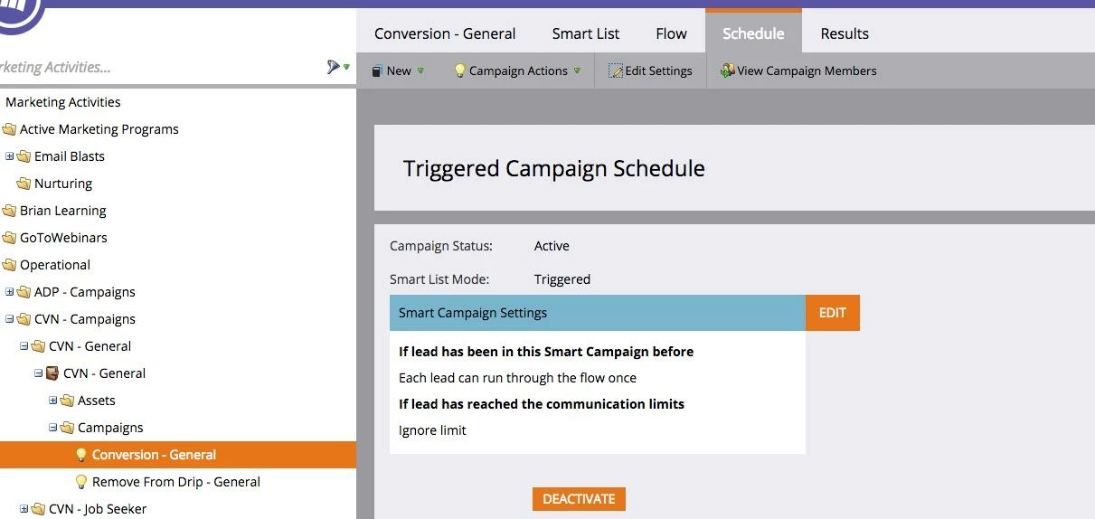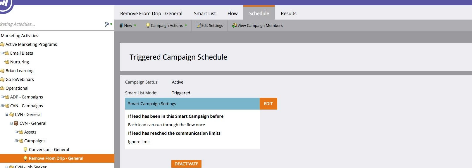 So I have a question for the group. Thought I had this working correctly, but do not. So basically we have a simple onboarding drip campaign for Trial users...the sign up, come in as Trial and they are on there way. What I am trying to do which is not working is that if the users PD_Account_Type Value changes from Trial to Paid they are removed from the Drip Campaign for the free Trial. I am doing this in a seperate smart campaign that I though basically sniffed that out...along with looking for people that have come in Paid, Comp and so on. Issue is they are not getting pulled out of campaign..and I need them to since the are paid and we are asking them to pay/upgrade in later emails. Here are the screen shots of each campaign...