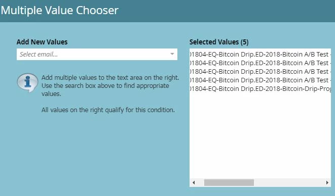 It seems that if i setup my SC's first without enabling AB tests they will see the emails and the filters will find the strings when I start typing. It also appears that it continues to see the strings of emails when I enable the AB test as the last step. But if I delete an email from the string in a filter (when AB has been enabled) and then try to find it again in the value finder, the email string won't appear.