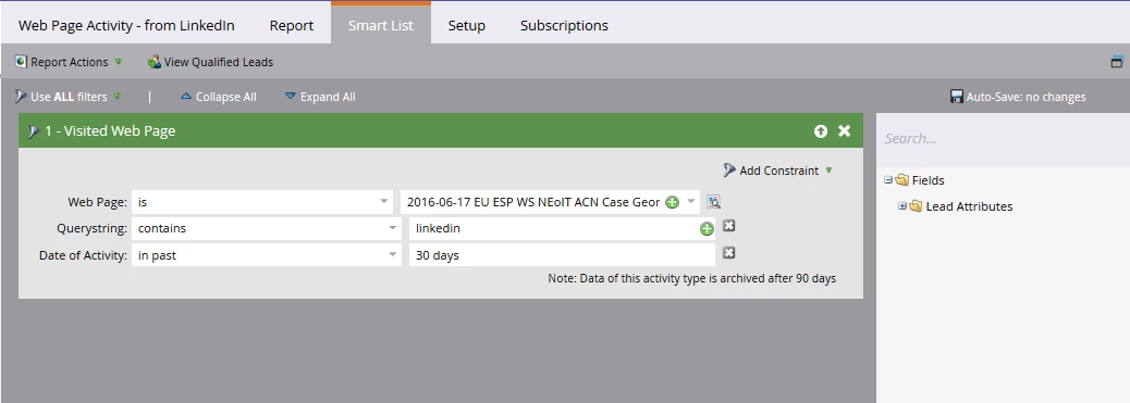 It is true that you wouldn't have access to the Visited Web Page activity history for anonymous lead records. That activity is stored differently and will only show and will only be able to be filtered on once the lead becomes known. So that part is accurate. The filters don't appear when the report setup is set to either of the Anonymous activity sources because of this.