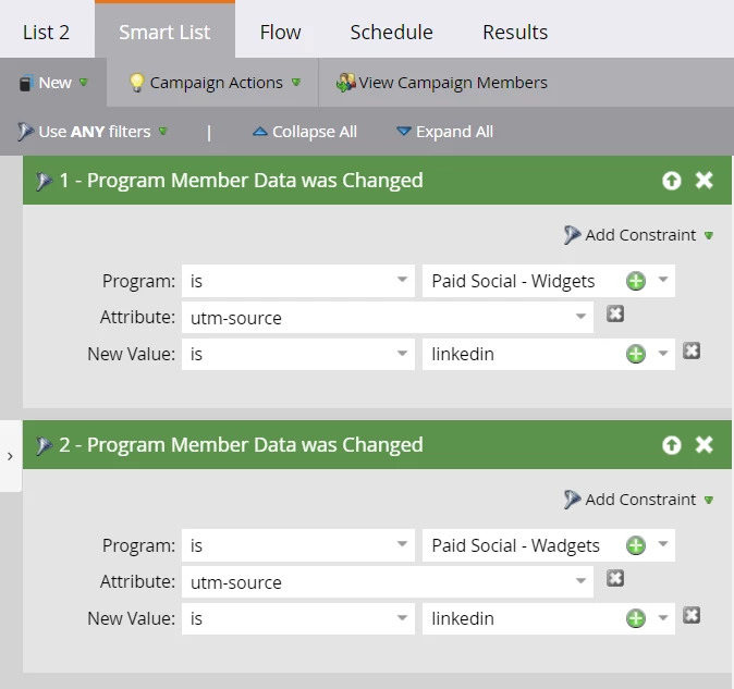 Leana is a marketer tracking where leads are coming from for her Acme social campaigns. utm-source is a program member custom field. She has exported the data from Adobe Marketo Engage for two programs: Paid Social – Widgets and Paid Social – Wadgets. The data can be found below: